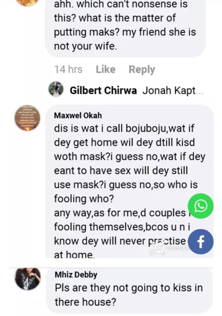 Ibitekerezo by’abakoresha imbuga nkoranyambaga byumvikanisha abashyingiranywe batagomba gusomana bambaye agapfukamunwa kuko n’ubundi baba baragera mu rugo bagasomana batakambaye.